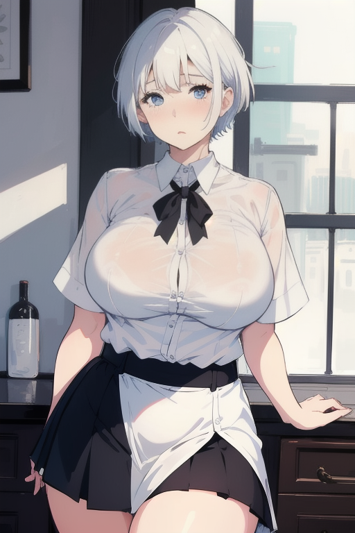 masterpiece, best quality, 1girl, woman, chubby body, embarrassed, blue eyes, white hair, short hair, pixiecut hair, white shirt, big breasts, black skirt