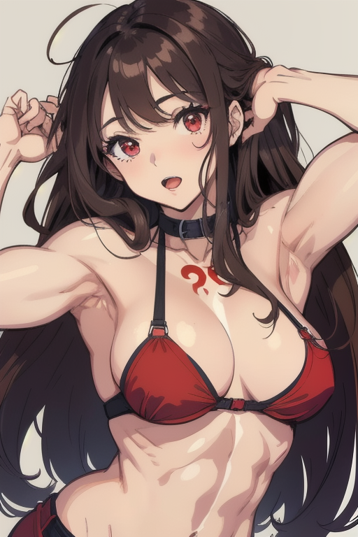 masterpiece, best quality, 1girl, woman, muscular body, medium breasts, excited, red eyes, brunette hair, long hair, messy hair