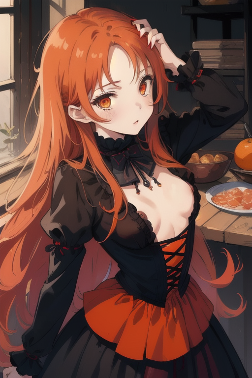 masterpiece, best quality, 1girl, girl, petite body, small breasts, maniac, orange eyes, red hair, long hair, messy hair, (gothic dress)